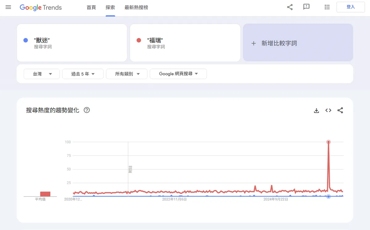 (3). 獸迷意思接近 furry 的 people 部分,並且專用於獸圈;但似乎台灣人反而比較常用福瑞這個詞。(資料來源:Google Trend*)