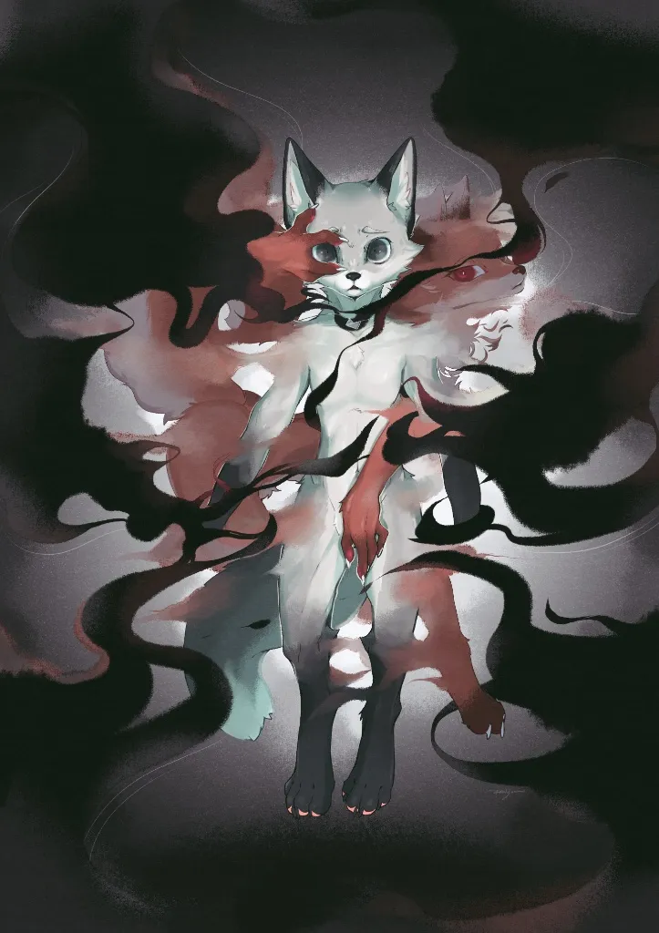 2. 關於「付費委託繪師畫出陰鬱的自己」:情緒的具象化與抽離 這點非常有趣。通常人們花錢買畫是為了裝飾或審美,而你是為了「看見自己」。 這讓我想到了藝術治療(Art Therapy)中的「外化」過程。你心中或許有一些難以言說的陰鬱、壓力或孤獨感(如圖二中那些黑色的手,圖三中蜷縮的姿勢)。如果這些情緒積壓在心裡,會很痛苦。但當你付費請人把它「畫出來」變成這隻灰狐時,這些情緒就變成了一幅可以被觀看的「作品」。 這讓你既能承認這些情緒(「看,這就是我現在的感覺」),又能與它保持安全距離(「這是一幅畫,我可以審視它,而不是被它吞沒」)。